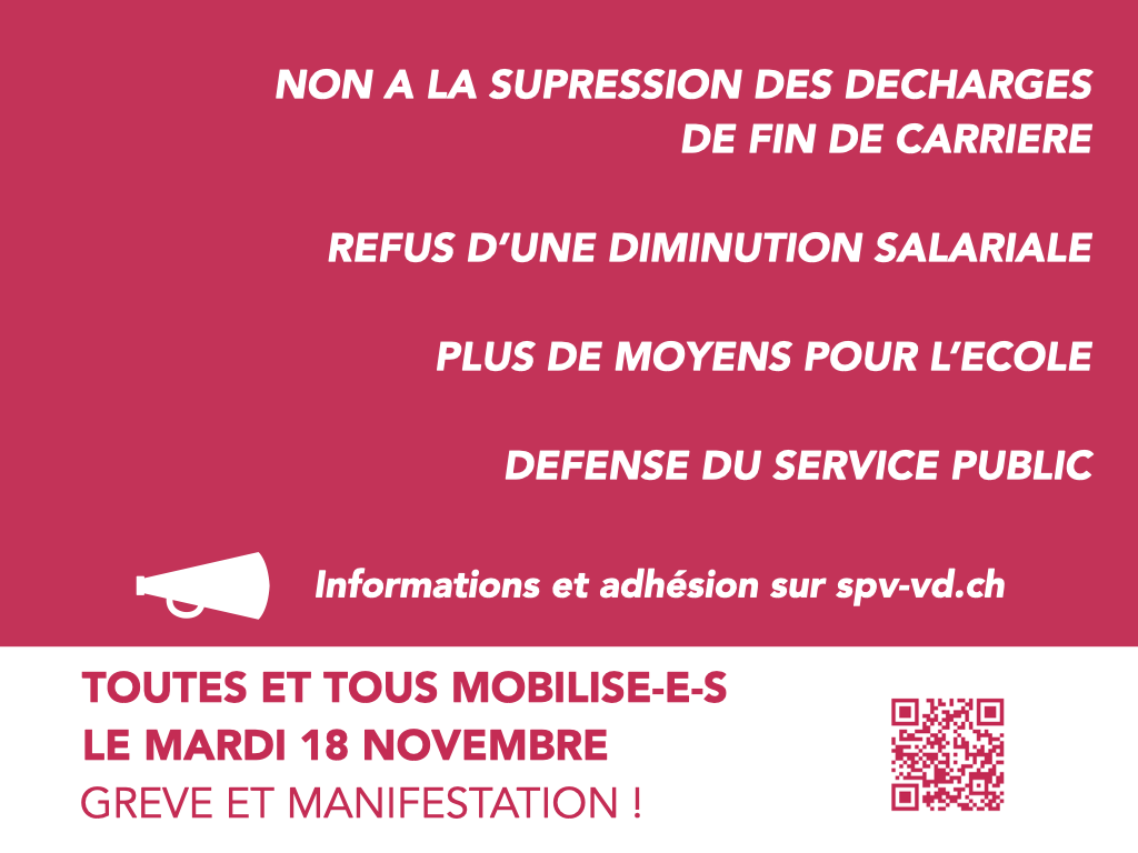 La SPV enjoint les collègues à une journée d’actions, de grève et de mobilisation le 18 novembre 2025. Ci-dessous, vous trouverez toutes les informations pour la grève. Pour la manifestation, le rendez-vous est fixé à 17h30 à Montbenon (départ du cortège à 18h00 en direction du château cantonal).