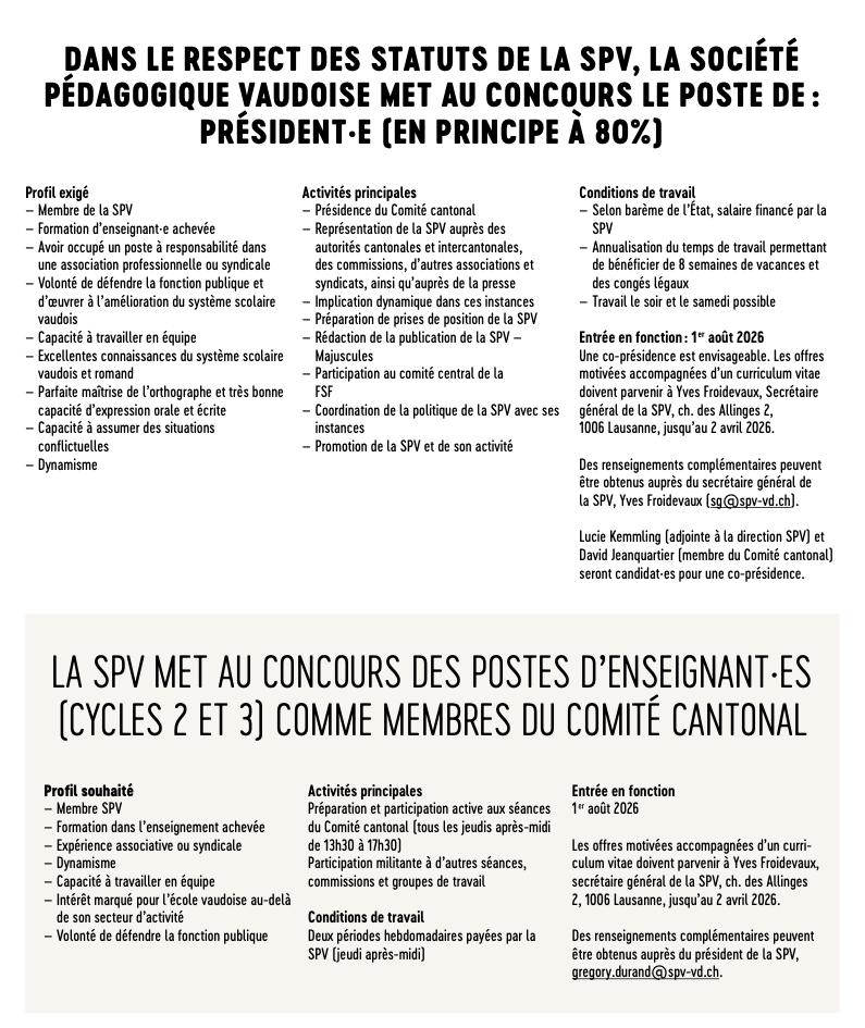 Après trois mandats, soit douze années passées à la tête de la SPV, le moment me paraît venu de permettre un nouveau souffle, une nouvelle énergie et de nouvelles perspectives pour notre association. Une organisation comme la nôtre a besoin de se renouveler pour continuer à défendre avec force et conviction l’école et celles et ceux qui la font vivre au quotidien.