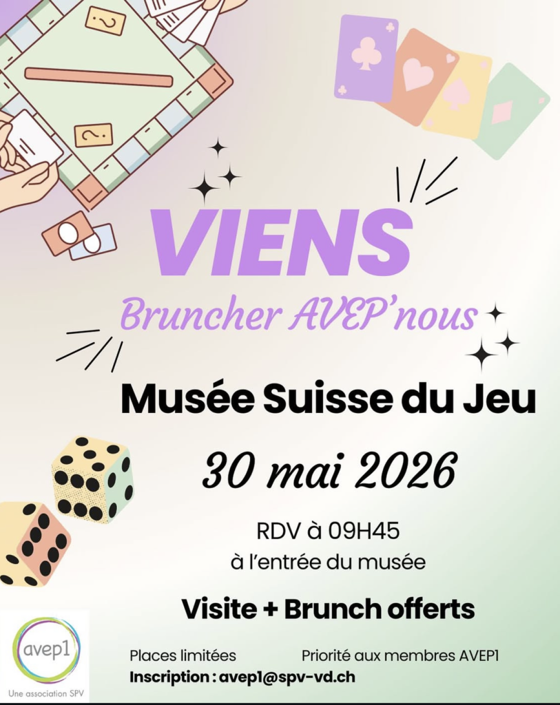 L'AVEP1 organise un brunch et une visite du Musée suisse du Jeu à la Tour-de-Peilz. Rendez-vous sur place à 9h45.